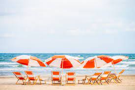 Relax and play on the cinnamon shores of Port Aransas in an iconic Cinnamon Shore chair & orange/white stripe umbrella.
